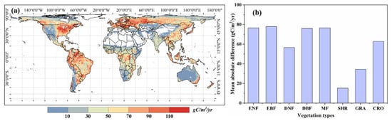 We compared the different vegetation types on the absolute NEP difference (Figure 4b). The results indicated that the forests, including ENF, EBF, DBF, and MF have a similar mean absolute NEP difference, with the absolute mean difference being around 76.8 g C m−2 yr−1. This was followed by CRO, for which the mean absolute NEP difference was 62.8 g C m−2 yr−1. The mean absolute NEP difference in SHR was the smallest, with the value being less than 15.2 g C m−2 yr−1. The results indicate that forests have larger interannual variabilities compared to other vegetation types on a global scale.