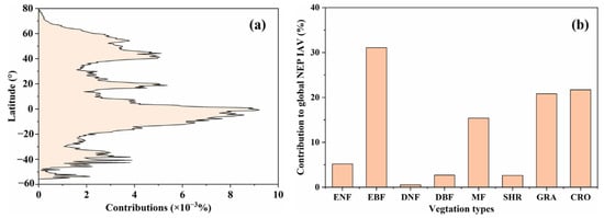 Contribution to global NEP IAV counted by (a) latitudes and (b) different vegetation types. Positive latitudes represent the Northern Hemisphere and negative latitudes represent the Southern Hemisphere.