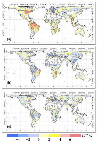 The spatial pattern of the contributions of climate variables to global NEP IAV is shown in Figure 8. The result indicated that the temperature contributed more than precipitation and solar radiation at the global scale. In southeast North America and northern South America, the contributions of the temperature were larger than 0.006%. In Europe and some areas of Asia, the contribution values were smaller than −0.002% (Figure 9a). Compared to temperature, precipitation (Figure 9b) and solar radiation (Figure 9c) played negative roles in global NEP IAV in most areas of global.