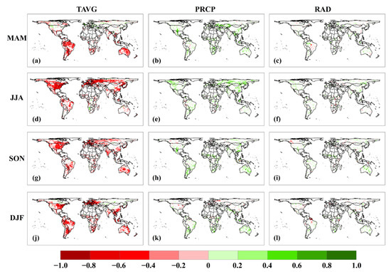 The partial correlation between anomalies of detrended NEP and TAVG, PRCP, and RAD in (a–c) MAM, (d–f) JJA, (g–i) SON, and (j–l) DJF. Shown are significant correlation regions (p < 0.01).