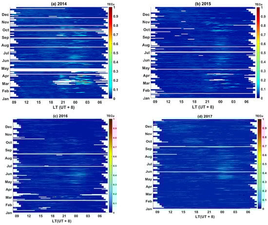 ROTIavg for the years 2014–2017. The abscissa axis shows the local time (LT: UT + 8) in hours. The ordinate axis shows the months of the year. The color bar shows the ROTIavg values in TECu.
