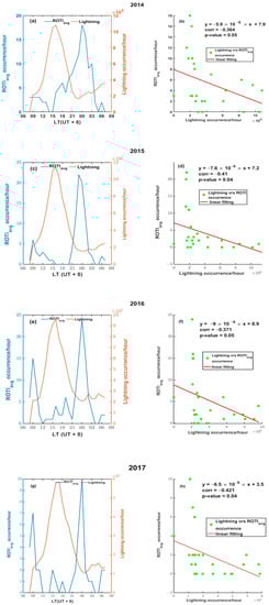 Panels in the left column (a–d) show the diurnal hourly occurrence of ROTIavg and lightning. Panels in the right column (e–h) are scatter diagrams showing the linear correlation between the diurnal hourly occurrence of lightning and ROTIavg for the respective years.
