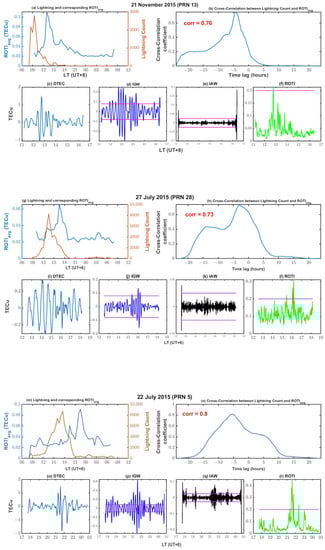 Some selected days (21 November 2015, 27 July 2015, 22 July 2015) where lightning was predominantly in the daytime (07–17 local time) and its cross-correlation with ROTIavg (top rows of each day). The associated ionospheric disturbances are also indicated by DTEC, IGW, IAW, and ROTI (bottom rows of each day) by satellites that passed some hours after the lightning activity. The magenta lines show the threshold of ±0.08 TECu, ±0.025 TECu and 0.2 TECu for IGW, IAW and ROTI respectively.