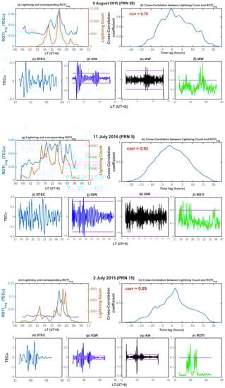 Some selected days (9 August 2015, 11 July 2016, 2 July 2015) where lightning was predominantly in the evening (18–06 local time) and its cross-correlation with ROTIavg (top rows of each day). The associated ionospheric disturbances indicated by DTEC, IGW, IAW, and ROTI (bottom rows of each day) by satellites that passed at the time of lightning activity. The magenta lines show the threshold of ±0.08 TECu, ±0.025 TECu and 0.2 TECu for IGW, IAW and ROTI respectively.