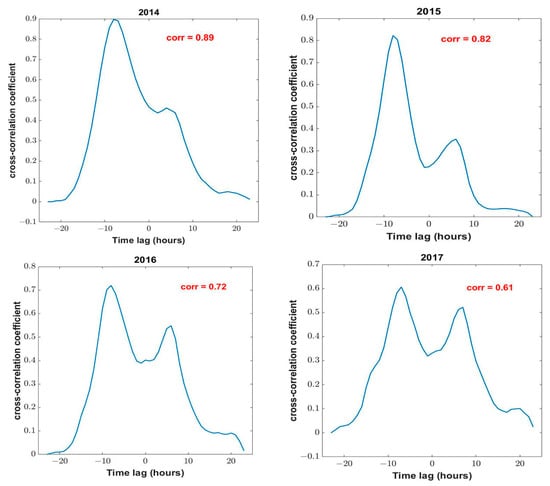 Following the mechanisms of the gravity wave, electromagnetic wave, and the Trimpi effect as discussed above, cross-correlation of the lightning and ROTIavg counts from the left panels in Figure 2 yielded positive correlation values of 0.89, 0.82, 0.72, and 0.61 for 2014 to 2017, respectively as shown in Figure 5. The values are similar to 0.86 reported by Amin []. This shows that the diurnal hourly lightning activity and associated ROTIavg have a positive correlation.