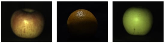Machine vision-based methods can evaluate the fruit quality based on characteristic information such as size, color, texture and so on, which is contactless, unified standards, highly efficient and of great importance to save manpower and material resources. Nowadays, this type of testing method is widely applied to the automatic fruit quality testing system, and the main working principle consists of image acquisition and specular highlight removal. When the fruit sample to be tested reach the image acquisition room, the camera captures the fruit image to the computer for processing, and finally the quality inspection result will be given based on the image processing result []. The schematic diagram of the automatic quality testing system based on machine vision is shown in Figure 1. To improve the accuracy and efficiency of fruit quality inspection, the researchers have been working to improve the performance of existing machine vision-based image processing algorithms. However, an important issue existing in the image acquisition process is ignored. Owing to the integrated influence of illumination and physical properties of target’s surface, the quality of target image is easily degraded by specular highlight []. For fruits with smooth skin and less texture as shown in Figure 2, they are easily affected by specular highlight during the image acquisition, resulting in light spots appearing on the surface of fruits, which severely affects the accuracy of subsequent quality inspection [,]. Specifically, the specular highlight areas existing on the surface may be misjudged as damage or fruit russeting and so on, which leads to an inaccurate quality inspection and evaluation results. Aiming at this issue, we need to propose a specular highlight removal algorithm that can be embedded into existing quality inspection systems to improve the accuracy and efficiency.