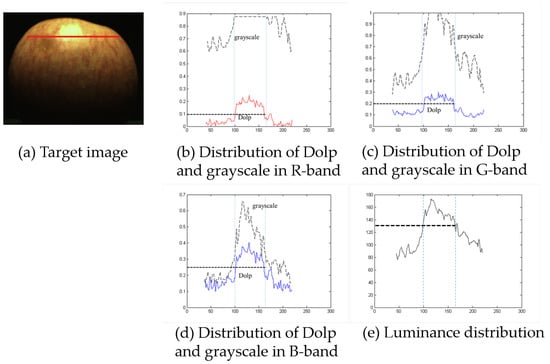 Based on the joint multi-band-polarization characteristic vector constraint, for the target image shown in Figure 3, The values of and are determined by the following analysis. Figure 5a is the target image, for the marked area of the target image in (a), the distribution statistical characteristics of Dolp, grayscale and luminance in R, G and B bands are shown in Figure 5b–e, where the X-axis is the pixel position, and the Y-axis is the values of each parameter. We can easily find the approximate pixel positions of specular area (100–170) from Figure 5b since specular has much higher grayscale values. So in Figure 5b, we can obtain the threshold of is 0.1; in Figure 5c, the threshold of is 0.2; in Figure 5d, the threshold of is 0.25. For the luminance , we can see the threshold is about 130 in Figure 5e, so the final threshold of is 0.5 after normalization.In a conclusion, we set . The value of is obtained by comparing the experimental results, and the best result of specular highlight area detection can be obtained when . The specular highlight detection result is shown in Figure 6.