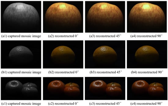 By using the CPDNet, we can reconstruct a color polarization image in three angles from a multi-band polarization mosaic image as shown in Figure 3d. The specific demosaicking process is not described in detail here, readers can refer to [] for more information.