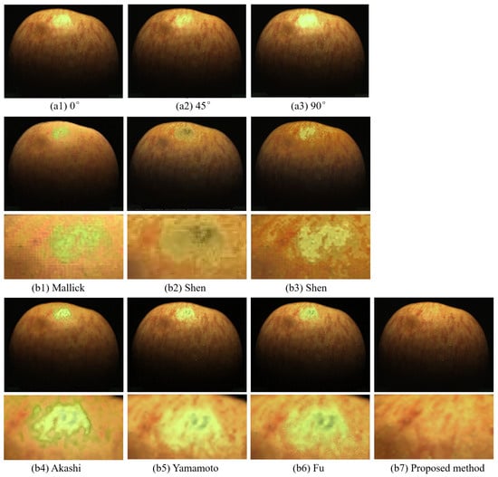 The specular highlight removal results of the 2nd scenario (a lemon). (a1–a3): reconstructed color images of target in different polarization angles. (b1–b6) are highlight removal results of Mallick [], Shen [], Shen [], Akashi [], Yamamoto [] and Fu [], respectively. (b7) is the specular highlight removal result of our proposed method. For easy observation, each result image is accompanied by an enlarged view of the detail information below.