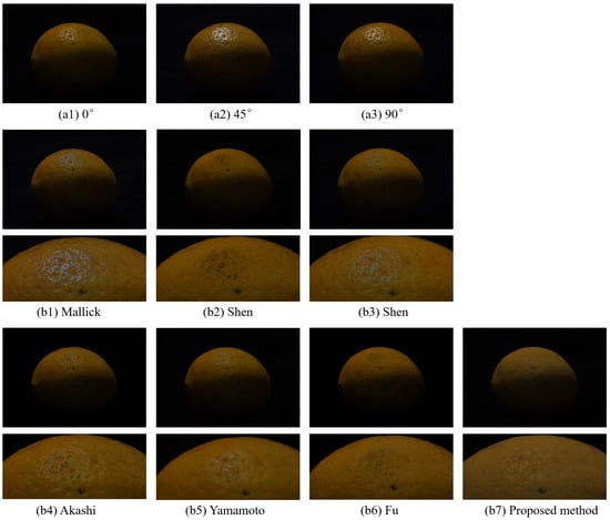 For the 3rd scene (oranges), its surface is a biological greasy epidermis with single surface color and simple texture, and the specular highlight area is large and dispersed in the target image. The highlight removal results are shown in Figure 10. Since the color space conversion cannot be effectively performed in the specular highlight area, it can be seen that in Mallick’s results, the highlight cannot be accurately separated and meanwhile data voids exist. The result of Shen [] contains a large area of data voids. Furthermore, the same problems also exist in the results of Shen [], Akashi [], Yamamoto [] and Fu []: blurred and distorted edges, and data loss. We can see that in the results of the first six methods, most of the information in the highlighted area is lost, and a black circle appears in each removal result, which will certainly affect the subsequent quality inspection results. In comparison, our proposed method has the best visual effect as shown in Figure 10(b7). Similarly, the combination of multidimensional information input and compensation of missing details guarantees that our method has better visual performance. It can be seen that the specular highlight is removed thoroughly, and meanwhile the original color, texture and other detailed information of the target surface is retained efficiently.