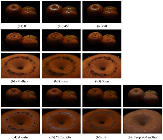 The specular highlight removal results of the 3rd scenario (oranges). (a1–a3): reconstructed color images of target in different polarization angles. (b1–b6) are highlight removal results of Mallick [], Shen [], Shen [], Akashi [], Yamamoto [] and Fu [], respectively. (b7) is the specular highlight removal result of our proposed method. For easy observation, each result image is accompanied by an enlarged view of the detail information below.