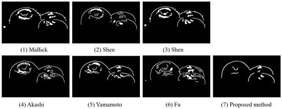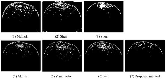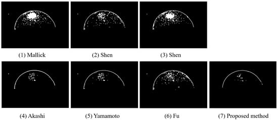 The damage detection results of the 1st scenario (an apple). (1–6) are damage detection results of Mallick [], Shen [], Shen [], Akashi [], Yamamoto [] and Fu [], respectively. (7) is the damage detection result of our proposed method.