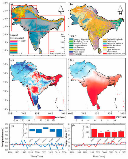 Spatial patterns of topography and elevation (a), and land use land cover (LULC) (b), across South Asia (SA) and its four subregions; (c,d) represent the annual precipitation and mean temperature distributions of spatial anomalies during 1980–2020; (e,f) demonstrate the annual and seasonal trends of precipitation (mm/year) and temperature (°C/year), and the regional averaged annual precipitation and mean temperature time series over SA. The blue and red solid lines in (e,f) characterize the precipitation and temperature changes over SA. The horizontal lines (black) indicate the average annual precipitation and mean temperature, while the dotted lines (blue and red) are the linear trends of annual precipitation and mean temperature, respectively. The asterisk *, **, *** represent trends passing the 95%, 99%, 99.9% significance levels, respectively.