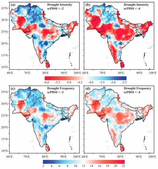 Spatial patterns of drought intensity and drought frequency during 1980–2020 across SA’s different subregions. (a,c) show drought intensity and frequency when scPDSI < –2, while (b,d) indicate drought intensity and frequency when scPDSI < –4, respectively.
