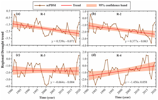 Regional drought time series across four different subregions (a–d) of SA from 1981 to 2020. The shaded belt indicates the 95% confidence band of the linear relationship.