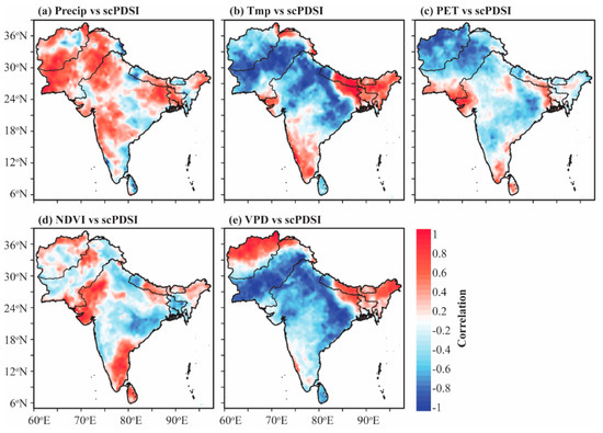 Pixel-wise spatial correlation coefficients between annual mean scPDSI and annual mean (a) precipitation, (b) temperature, (c) PET, (d) NDVI, and (e) VPD anomalies, in SA for the period of 1980–2020.