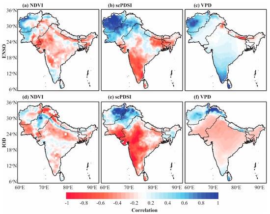 Spatial distributions of correlation coefficients between average scPDSI, NDVI, and VPD with ENSO and IOD events across SA during 1980–2020. The top first panels indicate the ENSO pattern, while the bottom panel shows the IOD distributions for all indices.