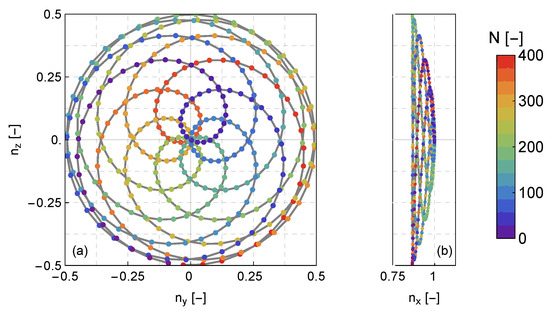 (a) Front and (b) side view of the scanning pattern of the SpinnerLidar. The scanning pattern is presented in terms of the unit vector components of each line-of-sight. The colour of each line-of-sight measurement (presented with a dot) corresponds to the data acquisition order, when a sampling frequency of 200 Hz is used, in combination with a scanning duration of two seconds.