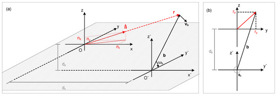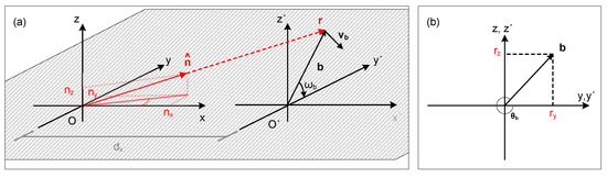 When the two coordinate systems are aligned along the x-axis, then the trigonometric functions of , as seen in Figure 4b, can, by the use of Equation (1), be written as a function of the vectors and as: