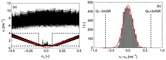 (a) Radial speed measurements versus the transverse component of the line-of-sight vector. The two horizontal dashed black lines depict the two velocity limits 0.6 ms and 4 ms used to select radial speed values that are attributed to the rotating blades. The modelling of the radial speed due to the blade and the subsequent determination of the SpinnerLidar position was applied only for (depicted with two vertical dashed black lines). (b) Histogram of the differences between the measured and the modelled radial speeds using Equation (7) for the data that was acquired when .