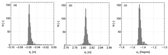 Histograms of the estimated values of the (a) transverse and (b) vertical displacement, as well as of (c) the yaw alignment of the SpinnerLidar in relation to the centre of the rotor.