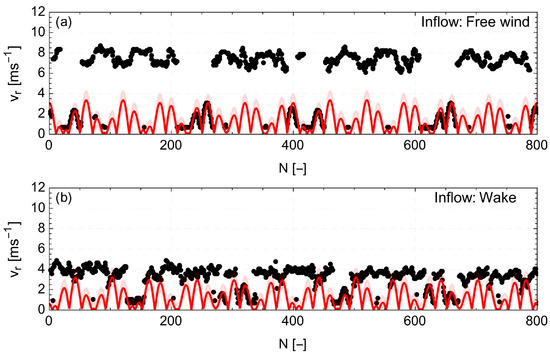 Time series of radial speed measurements (black points) acquired with a 200 Hz sampling frequency. The theoretical speed, if it is assumed that the lidar is detecting all the time a rotating blade, is presented with a red line. The estimated deviation from this value due to the varying speed of the rotor within a 10 min period is marked by the red-opaque shaded area. The time series correspond to different inflow cases: ((a) free flow and (b) wake flow).