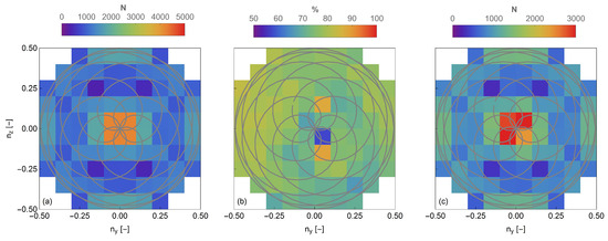 (a) Number of measurements, (b) data availability, and (c) the eventual number of wind observations using a 10 × 10 grid based on the transverse and vertical components of the line-of-sight unit vector, over a 10 min period. The grey rosette pattern represents the scanning trajectory. The data corresponds to a case when the mean wind speed was 7 ms and in the direction of 256.