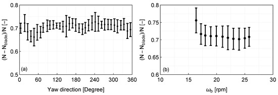 Mean data availability, defined here by the relative difference between the total amount of measurements N and the number of blade signals detected per (a) yaw direction and (b) rotor speed, over a 10 min period. The error bars correspond to one standard deviation about the mean.