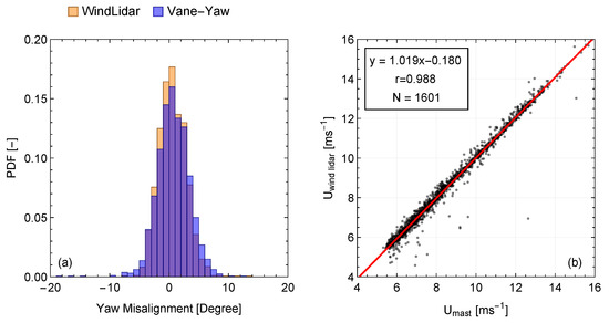 (a) The histogram of the yaw misalignment estimated using the measurements of the wind direction at the meteorological mast and the yaw direction of the wind turbine. (b) Scatter plot of the magnitude of the mean horizontal wind speed vector measured by a cup anemometer (U) and the SpinneLidar (U) at 44 m.