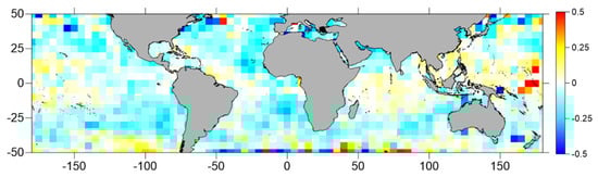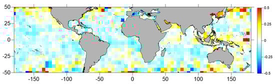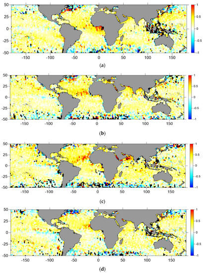 Maps of the mean SSTskin differences, in K, between the Sentinel-3A SLSTR sensor and the ERA5 atmospheric model (SSTSLSTR₋SSTERA5), derived for Sentinel-3A SRAL cycles 13, 17, 21 and 24 (subpanels (a–d), respectively), represented with a 2° by 2° spatial resolution. Blank pixels are shown in black.
