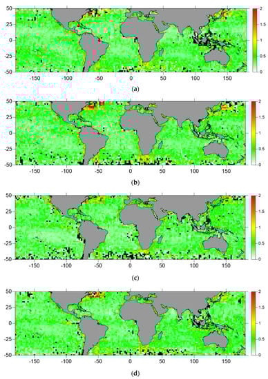 Maps of the standard deviation of SSTskin differences, in K, between the Sentinel-3A SLSTR sensor and the ERA5 atmospheric model (SSTSLSTR₋SSTERA5), derived for Sentinel-3A SRAL cycles 13, 17, 21 and 24 (subpanels (a)–(d), respectively), represented with a 2° by 2° spatial resolution. Blank pixels are shown in black.