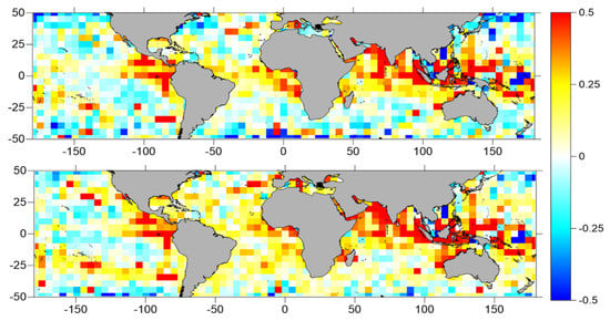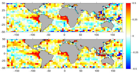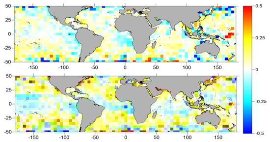 Differences, in cm, between RMS values for Algorithms 1–3 (top panel), and Algorithms 2–4 (bottom panel), represented with a 5° by 5° spatial resolution.