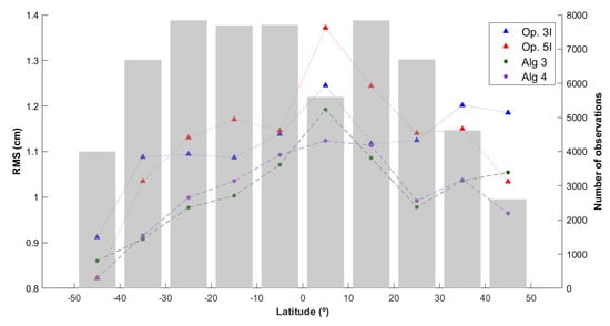 RMS of WPD differences, in cm, for Algorithms 3 and 4 and the operational algorithms, function of latitude, against SI-MWR.