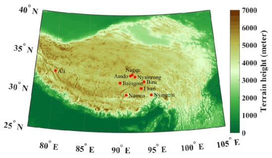 Topography of the Tibetan Plateau, with 9 plateau stations being denoted by red dots. It should be noted that the Nyingchi station was excluded from our study after the data quality control steps were completed.
