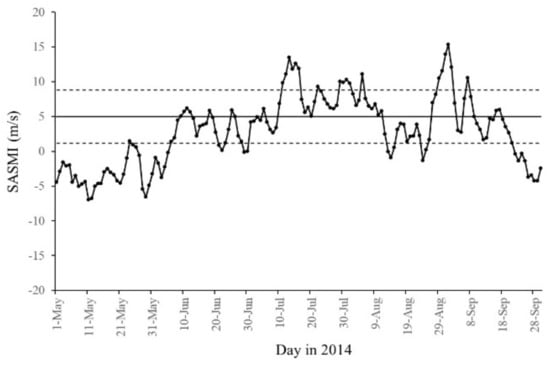 Variations in the SASM index (SASMI), with the averaged SASMI value (5.0 m/s) shown as a solid line, dashed lines represent one standard deviation (3.8 m/s) above and below the mean value.