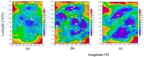 Outgoing long-wave radiation (OLR) distributions over the South Asia and TP regions, averaged for the (a) observation period, (b) SASM active period, and (c) SASM break period, with a contour interval of 10 Wm−2.