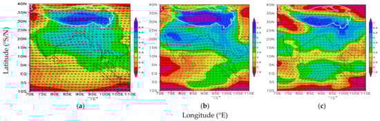 To illustrate convection related to the SASM evolution, the outgoing long-wave radiation (OLR) was averaged for the entire observational period and for the SASM active and break periods; their distributions are shown in Figure 3. The low OLR values represent strong convection and vice versa. During the observational period (Figure 3a), there were three strong convective activity centers (with OLR values lower than 190 Wm−2) in the eastern part of the Bay of Bengal, the northeastern part of India and the central portion of TP. During the SASM active period (Figure 3b), the strong convective activities over the Bay of Bengal and North India both intensified and extended northward, with central OLR values less than 160 Wm−2. The convection over the central TP became more severe and enlarged, with central OLR values lower than 160 Wm−2 and covering almost the entire TP region. During the break period (Figure 3c), however, all the three convections moved southwards, and the convective activity center over the TP as shown in Figure 3a retreated to the south of TP. Therefore, obvious differences can be found in the OLR distributions between the SASM active and break periods, especially over the TP regions, representing the dominant strong and weak convections there.