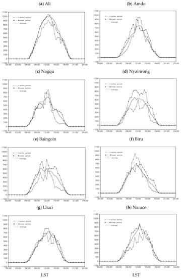 Figure 5 shows the diurnal variations of the downward shortwave radiation flux (DR), averaged for the observations period, SASM active, and break periods. The diurnal variations of DR are similar for all stations, showing increases at approximately 06:00 LST (local standard time) near sunrise, reaching a maximum at noon, and decreasing to almost zero at approximately 18:00 LST near sunset. However, large DR amplitude differences were found among the 8 plateau stations. The strongest DR occurred over Ali station (northwest plateau), with daily average and maximum values of 319.2 and 1007.8 Wm−2, respectively, which is mainly due to the low precipitation and less moisture in the air. Ali station is located in the northwest of the Qinghai-Tibet Plateau, and Ali is a very dry area with very little rainfall. According to the observation data, Ali station had no precipitation from July to September in 2014, resulting in low water vapor content in the air. The second strong DR is found over Namco station (southeast plateau), with daily averaged and maximum values of 222.9 and 846.3 Wm−2, respectively. For the other stations, the DR differences are noticeably smaller, and the difference of the daily averaged values was less than 20 Wm−2, with a variation between 187.3 Wm−2 and 206.1 Wm−2. During the SASM active/break periods, the DR is greatly weakened/strengthened at most plateau stations. For example, the daily averaged value of DR at the Baingoin station was 194.2 Wm−2 during the observation period, and the DR varies from 133.2 Wm−2 (weakened by 31.4%) during the SASM active period and 234.5 Wm−2 (strengthened by 20.8%) during the break period, respectively. The weakened/strengthened DR is closely related to the strong/weak convections over the plateau region during the SASM active/break periods (see Figure 3). The strong/weak convections can result in more/less cloudiness, which further affects the solar radiation by blocking/enhancing effects [,,].