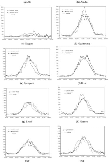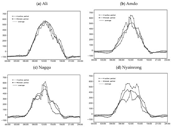 Diurnal variation of the downward short-wave radiation flux (DR) (units: Wm−2) from 8 stations, averaged for the observations, SASM active, and break periods.