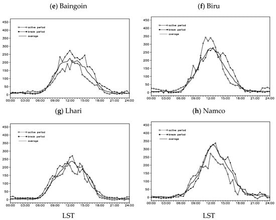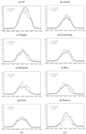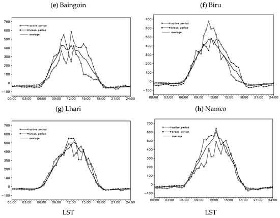 Figure 8 presents the diurnal variation of latent heat flux (LH), averaged for the observations, SASM active, and break periods. Differing from the sensible heat flux, the latent heat over the TP is always transferred upwards (positive LH values) during the entire day. In addition, the amplitude of LH was much larger than that of SH over most of the plateau stations and that was consistent with previous results []. Obvious differences are seen in the LH daily averaged and maximum values among the 8 plateau stations. During the observation period, the largest latent heat transfer occurred at Nagqu station (central plateau), with daily averaged and maximum values of 74.7 (see Table 3) and 238.6 Wm−2, respectively. The smallest LH occurred at Ali station (northwest plateau) due to small amounts of precipitation there, with daily averaged and maximum values of 10.1 and 27.2 Wm−2, respectively. Over the other stations, the diurnally averaged LH varied from 53.0 to 74.4 Wm−2, and the maximum values varied from 152.8 to 245.7 Wm−2.