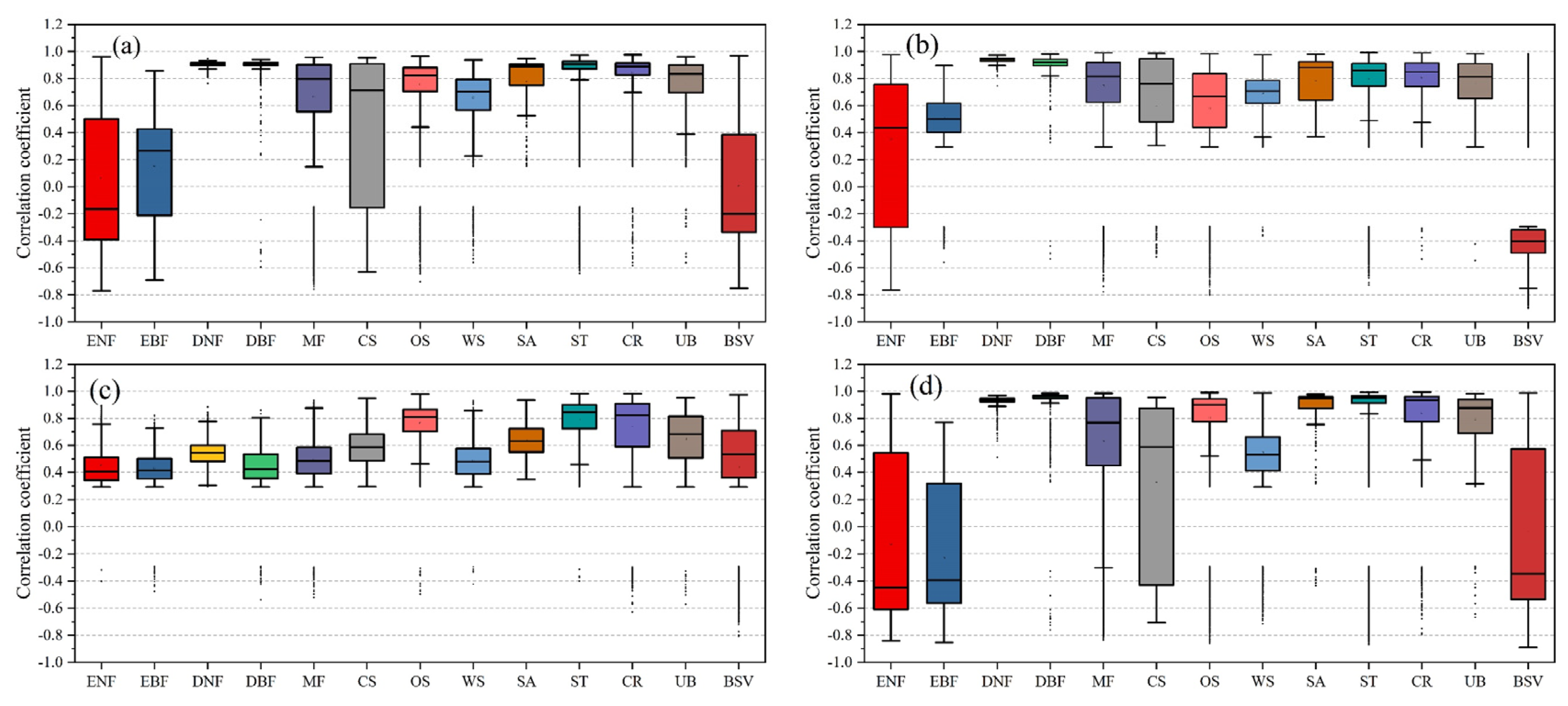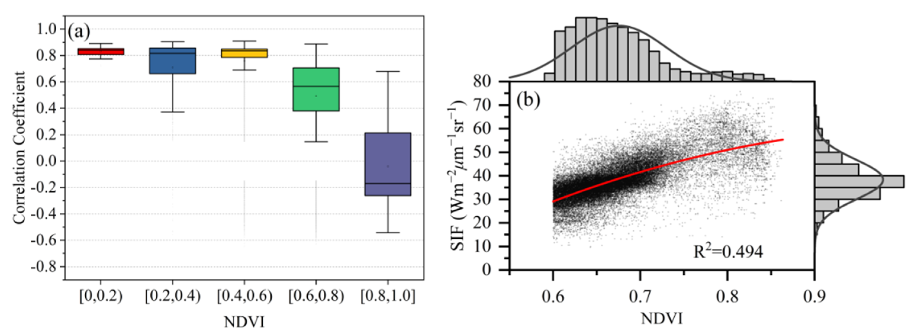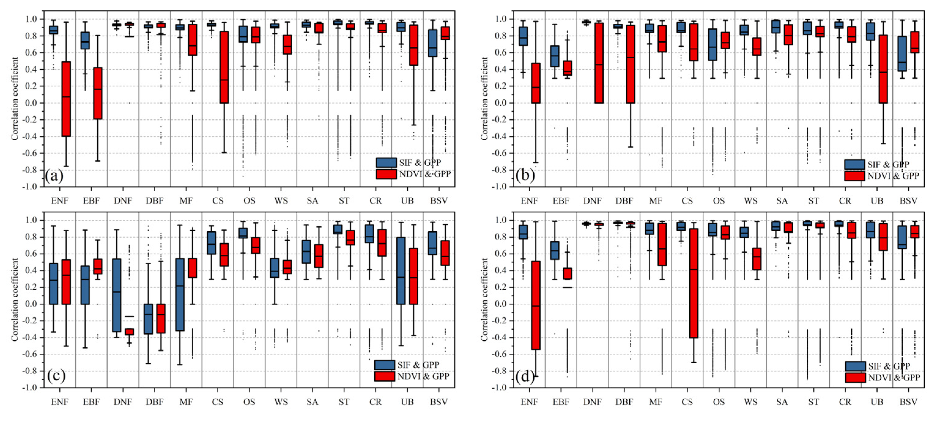 - The spatial distribution characteristics of the relationships between the SIF (NDVI) and the GPP were similar among different seasons, and the correlations were smaller in southern China and northwestern China than in the other regions of China. In general, the correlations between the SIF (NDVI) and the GPP were smaller in the forest vegetation regions during summer than in other seasons. Moreover, the SIF had a stronger correlation with the GPP than the NDVI did in different seasons.