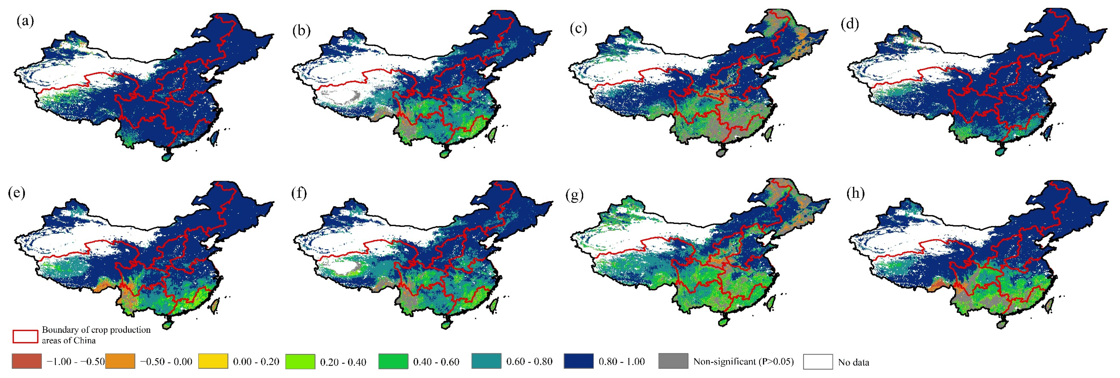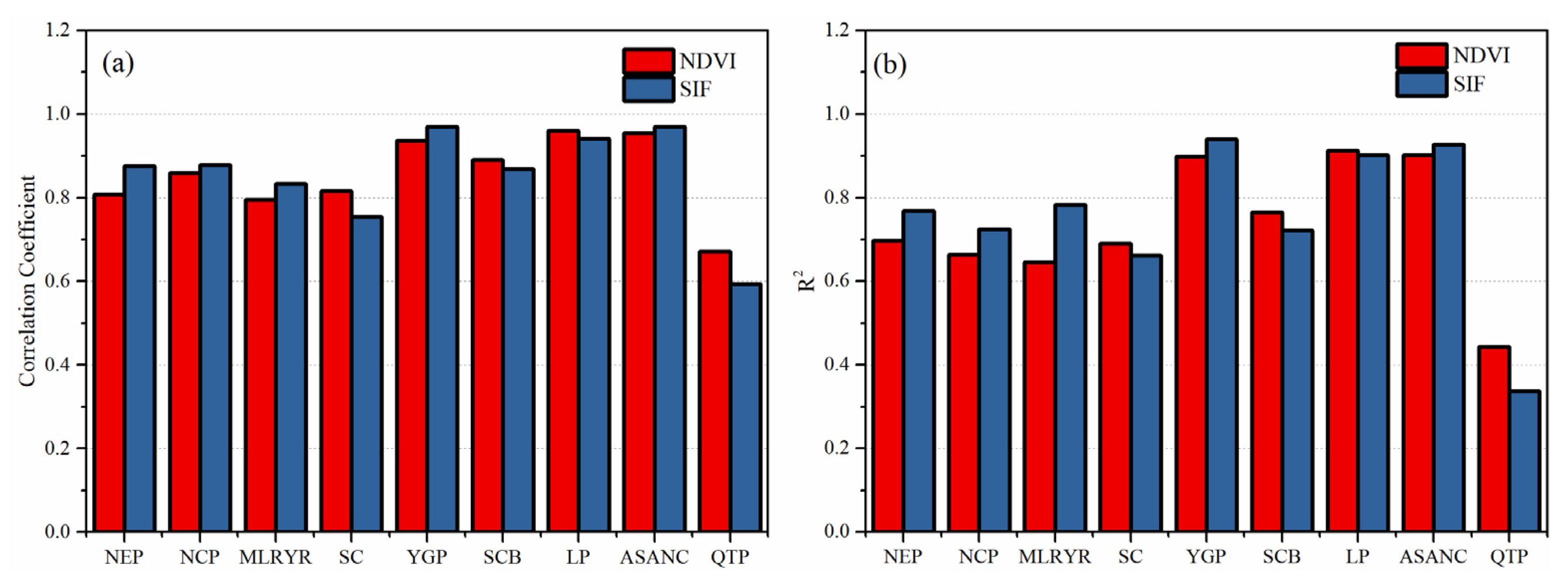 - The NDVI and SIF change trends showed that decreasing vegetation trends were mainly concentrated in the northern part of Xinjiang, in part of the QTP, and in a small part of northeastern China. The NDVI and SIF were more closely related in all the analyzed land-cover type regions than ENF and EBF areas.