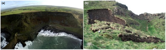 The area is influenced by regular mass movements in the form of rockfalls, debris slides, complex landslides, and block falls (Figure 2b). Observations over the past two decades have identified that the frequency, intensity, and distribution of slope failures across the site are increasing in response to climatic changes such as increased rainfall and more frequent and prolonged storm events []. Over the past decade, the National Trust has recorded over 300 rockfall and landslide events. This poses a potential significant risk to visitors who regularly use the lower coastal paths and also the paths that are developed on the weak scree slope leading to the headland. Much of the slope failures impact the lower path frequently (Figure 1c) used by visitors and The National Trust staff. The natural causes of the slope failure are a combination of the geomorphological steep-sided slopes and cliffs; the variable competency of the geological strata, such as the IBF, which is a weathered horizon; and the undercutting of cliffs by marine erosion. Rainfall plays a major role in triggering slope failure, penetrating the stratigraphy through the jointing within the basalt leading to increased pressure within the slopes and further weathering of the cliff.