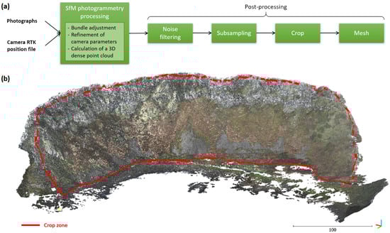 (a) Processing chain for the “expert” dataset used as reference. The SfM photogrammetry processing is performed by using Agisoft Metashape, and postprocessing steps are performed by using CloudCompare. (b) Resulting 3D mesh before cropping to a common zone for comparison.