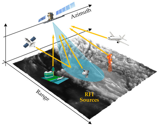 Various electromagnetic devices operating in the same frequency band as SAR systems are major sources of RFI. In recent years, many RFI cases have been observed in spaceborne and airborne SAR data, among which the main sources are not only space-based sources such as airborne radars and co-frequency satellites but also ground-based sources such as ground base stations and ground-based radars. In general, the spatial relationship between the RFI sources and the irradiated area of the spaceborne SAR beam is shown in Figure 1. For ground-based sources, RFI is usually received in the form of direct waves by the main or side lobes of the SAR. For space-based sources, RFI is usually received by the SAR in the form of direct or scattered waves.