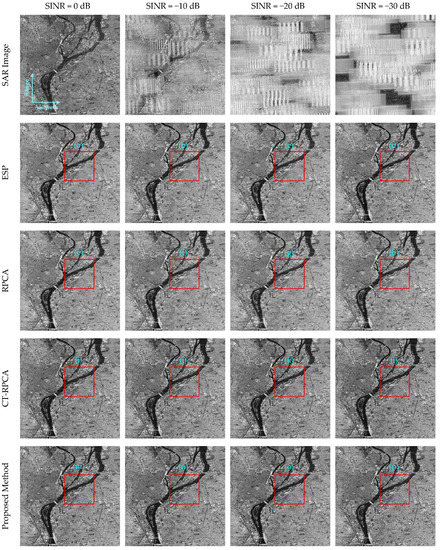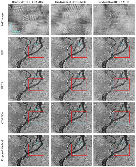 Table 3 summarizes the RMSE comparison results of ESP, RPCA, CT-RPCA, and the proposed method under different RFI bandwidths.