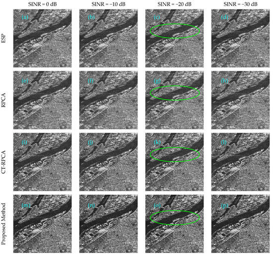 RMSE describes the normalized difference between the original and recovered SAR data. The smaller the RMSE, the better the mitigation performance. Table 2 summarizes the RMSE comparison results of ESP, RPCA, CT-RPCA, and the proposed method under different SINR conditions. The results show that the RMSE of the proposed method is lower under different SINR conditions, which means that the proposed method has a more prominent signal protection performance while mitigating RFI.