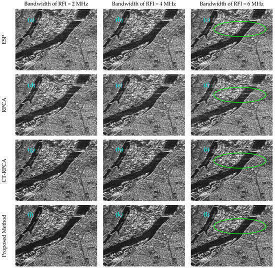 Simulation experiments were used to explore the proposed method’s mitigation performance under different RFI bandwidths and compared with ESP, RPCA, and CT-RPCA methods. The experimental results are shown in Figure 8. From the first row, it can be seen that RFI with different bandwidths has different degrees of influence on the SAR image. When the bandwidth of RFI is 2 MHz, the four methods can effectively mitigate RFI. While the details in the SAR images using the proposed method are clearer, indicating that it is more effective in protecting useful signals, which is verified by subsequent quantitative analysis. When the bandwidth is increased to 4 MHz, the high sidelobe effect caused by the ESP and RPCA methods is more obvious in the SAR images, and the proposed method still shows excellent performance. When the bandwidth is increased to 6 MHz, the RFI mitigation performance of the proposed method degrades.