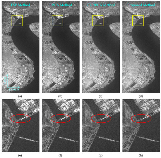 Experimental results for Sentinel-1 level-0 raw data: (a) Mitigation result by the ESP method; (b) Mitigation result by the RPCA method; (d) Mitigation result by the CT-RPCA method; (c) Mitigation result by the proposed approach; and (e–h) ROIs with the yellow box in (a–d).
