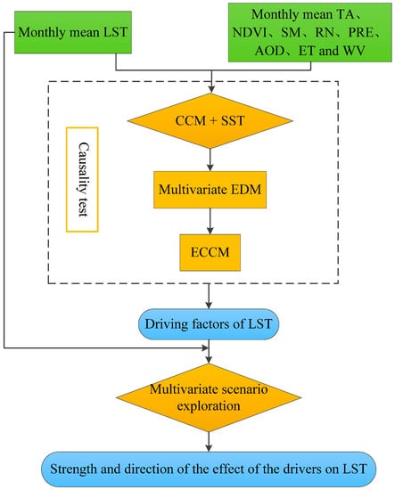 Flowchart of the causality detection between LST and environmental factors.